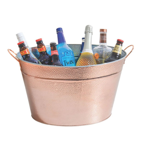 An impressive feature piece, this wine cooler bucket brings the trendy copper look to the forefront of any party or get-together. Made of galvanised steel with a copper colouring, it’s suitable for indoor or outdoor use, and for all sorts of drinks. Serve up chilled beers, champagne on ice, or refreshing soft drinks, and save on trips to the fridge to top up. Its hammered finish only adds to the attractive copper glint.