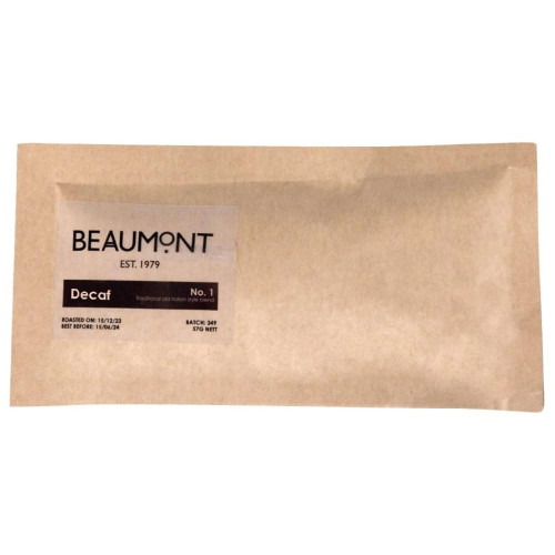 Beaumont No.4 decaf coffee has all the taste of a Brazilian coffee, but with 97% of the caffeine removed. It contains a blend of 100% Brazilian Arabica beans with notes of dark chocolate, toffee and shortbread. Hand-roasted and packed in the UK, it's a nutty, sweet and easy drinking decaf coffee.