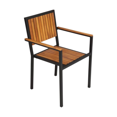 Looking for a stylish design and excellent practicality, blended into a single armchair? Then Bolero's steel arm chairs are a clever pick for your business. Designed with a black frame and acacia seatpad and backrest, these armchairs boast a natural, yet industrial look that help to spruce-up your dining areas and keep guests coming back!