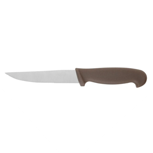 Long-lasting, light, and affordable, this versatile paring knife is ideal for use in any high-volume commercial kitchen, as well as culinary schools and cafeterias. Great for preparing all manner of fruits and vegetables, the short blade allows for precise control while effortlessly peeling, slicing, and cutting. With this knife, creating a fresh vegetable stew or refreshing fruit salad is not only possible, but easy! This knife has a brown coloured handle that allows it to stand out and makes it great for creating a color-coded system in your kitchen to prevent cross-contamination.