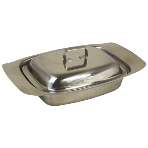 High-quality stainless steel butter dish for use in the catering trade and restaurant environment. This high-quality butter dish is entirely made of polished stainless steel. Its neat and aesthetically pleasing design makes it perfect for front of house use. It is also hard wearing and durable with an all-metal handle.
