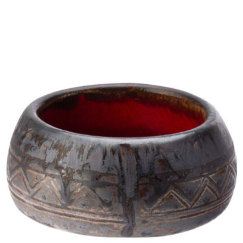 Carthago is available with two stunning interior finishes, a jewel-like deep red and a richly toned stone, each is encased within a dark exterior. The pieces are further enhanced with hints of metallic colour a subtly embossed geometric pattern. The combination of reactive glazes and hand finishing makes each item unique.