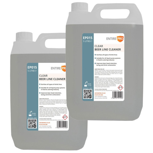 Entire Pro Clear Beer Line Cleaner 5 Litre, cleans all types of lines pipes and valves. This high-strength sterilising cleaner helps to maintain beer lines and keep them in hygienic condition. The fast-acting anti-bacterial formula will prevent yeast build up in pipework, helping to improve beer taste, head retention and carbonation. Can be used to sterilise and fully sanitise all types of liquid pump systems in the food industry. This high strength concentrate formula can be diluted before use.