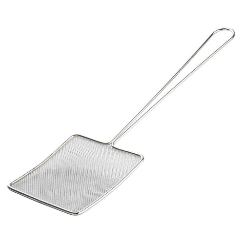 Quickly and efficiently skim the surface of cooking liquids with this fine mesh rectangular skimmer! Features a long handle to keep hands away from hot liquids, this skimmer is made of nickel-plated wire that's easy to clean.