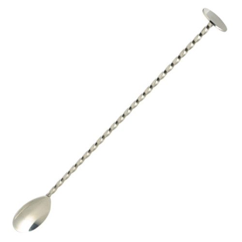 Genware Classic Cocktail Mixing Bar Spoon 27cm with stainless steel construction. Essential product for any mixologist or bartender stirring cocktails. Spiralled shaft helps effortlessly stir the drink and features a flat disc on end to bruise delicate cocktail ingredients such as herbs.