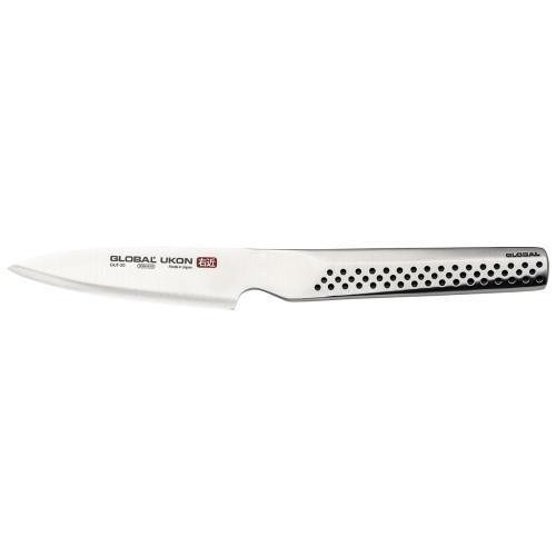 The Global Ukon GUF-30 Paring Knife is a must-have tool for any professional chef. It can be used for a wide variety of kitchen tasks from simple slicing and light peeling, to skilled intricate work. The small, forged blade makes the knife extremely robust and great for hand peeling, precision cuts and garnishing. It is also useful for deveining shrimp or removing seeds.