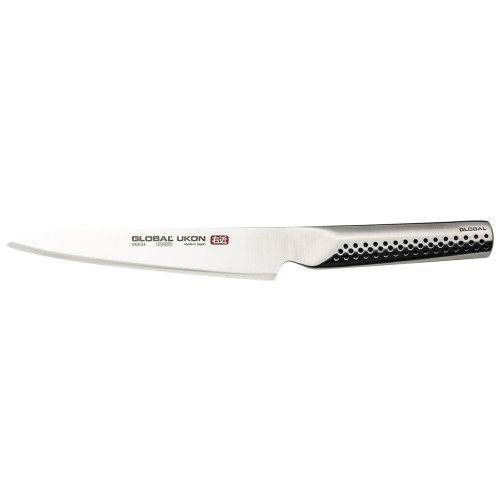 The Global Ukon GUS-24 Utility Knife is great for chopping smaller foods such as shallots, avocado and cheese. This multiskilled knife shares many qualities of a chef’s knife but is well suited to working with smaller food items, allowing for more precise, delicate cutting work. The GUS-24 Utility Knife is also useful as a small carving knife.