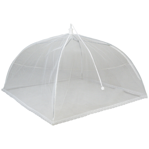 This foldable square food cover protects foods and contents from dust and insects when eating outside. The convenient umbrella style cover features an easy pull string action with locking mechanism, to assemble and then collapse when required for easy storage. The cover also features extremely fine mesh for ultimate protection and lace edging.
