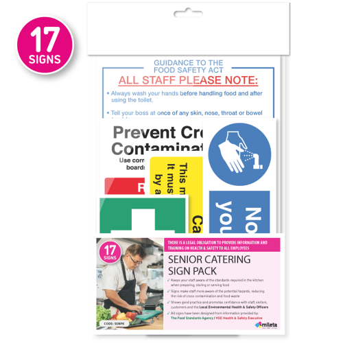 This large catering sign packs is designed to help businesses keep their staff aware of all aspects of food hygiene and health and safety in the kitchen. Contains 17 essential signs for use around your kitchen, food preparation and storage areas. Fully compliant with Health & safety law, this large catering sign pack is fully compliant with Food Safety Regulations and HACCP.