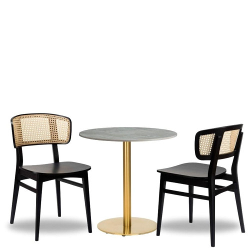 Combining classic materials with a clean modern profile, this Sophia Rattan bistro set offers a refined balance of warmth and contemporary design. The natural cane backrests of the Sophia side chairs add artisanal charm to the sleek black frame, while the Grey Tundra ceramic tabletop introduces a soft stone aesthetic that’s both durable and easy to maintain. The round top is supported by a luxe brushed gold Midas base, delivering a polished and high-end finish ideal for boutique hospitality environments.