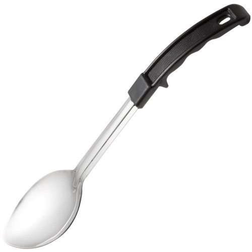 Baste roasted chicken with flavourful broth and herbs with this basic yet functional 13" solid basting spoon. Made of smooth 18/8 stainless steel, this spoon will hold light or heavy dishes from broth to stew and drizzle the perfect amount of meat drippings over your most delicious dishes. Its black bakelite handle is engineered to be lightweight and more graspable than ordinary handle bases, and the convenient built-in notch will prevent this spoon from sliding into the pan. Bakelite handles are heat resistant up to 110°C.